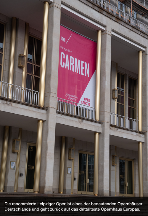 Leipzigs erstes Opernhaus, das Opernhaus am Brühl, wurde am 8. Mai 1693 auf Initiative der Bürgerschaft der Stadt feierlich eröffnet. Damit war es nach Hamburg und Venedig das drittälteste bürgerliche Opernhaus Europas. Die Oper Leipzig ist die Dachmarke der drei Sparten Oper, Ballett und Musikalische Komödie mit ihren beiden Spielstätten, dem Opernhaus am Augustusplatz (Foto rechts) und dem Haus Dreilinden im Stadtteil Lindenau. Das Gewandhausorchester, eines der weltweit führenden Orchester, spielt seit 1840 alle Vorstellungen des Opernhauses. Die Oper Leipzig ist ein städtischer Eigenbetrieb der Stadt Leipzig und mit rund 670 Angestellten einer der großen Arbeitgeber der Stadt.
