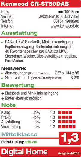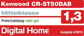 "Für gerade mal 99 Euro bietet Kenwood mit dem CR-ST50DAB ein modernes Radio in klassischer Bauform. Neben herkömmlichem UKW-Empfang setzt es auf moderne Tugenden wie DAB+ und Bluetooth. Die Empfangsleistung ist überragend, die Klangqualität sowohl bei Sprache und Musik in dieser Klasse sehr gut. Sleep-Timer und Wecker runden die Ausstattung, die nichts vermissen lässt, ab. Dank Netz- und Batteriebetrieb macht es auch unterwegs eine gute Figur. Darüber hinaus stimmt die Verarbeitung. Erhältilich ist das CR-ST50DAB in schwarz, weiß oder anthrazit.“