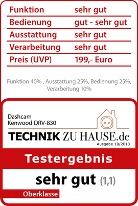 "Mit der DRV-830 bietet Kenwood eine kleine Dashcam, die mit toller Ausstattung überzeugt. Die Bildqualität ist auch bei schlechten Lichtverhältnissen bestens, die Funktionalität sehr gut. Neben der kontinuierlichen Aufnahme der Fahrsituation lassen sich Fotos sowie manuelle Videos aufzeichnen. Einfache Assistenz- bzw. Warnsysteme unterstützen den Fahrer. Die Software zur Auswertung der Videos arbeitet tadellos und komfortabel. Für 199 Euro ist die DRV-830 eine echte Empfehlung. Im Falle eines Falles hat man somit immer und automatisch objektives Beweismaterial.“