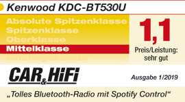 Das Kenwood KDC-BT530U bietet makellose Messwerte, starken Sound und gute Bedienbarkeit. Highlights sind die tolle Bluetooth-Funktionalität inklusive Spotify Control und die Einstellmöglichkeiten des DSP.“