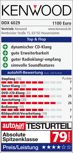 Fürs Geld erhält man eine bestens verarbeitete Headunit mit großem 7-Zoll-Touchscreen, die eine ordentliche Grundausstattung besitzt und mit allen möglichen Spielereien aufgerüstet werden kann. (…) Dass der Kenwood DDX60029 nicht nur viel kann, sondern das auch noch gut, merkten wir spätestens, als wir eine Musik-CD oder Video-DVD in den Schacht hinter der motorisierten Front geschoben hatten. Sofort legt der Player dynamisch los, packend, fetzig und mit ordentlich Rumms in den unteren Frequenzlagen. (…)