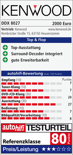 Fazit: Fahrer von Autos mit doppeltem DIN-Schacht sind zu beneiden, denn sie können den DDX8027 so leicht einbauen wie ein normales Autoradio. Der Kenwood-Moniceiver bietet Ausstattung, Erweiterungsmöglichkeiten und Top-Klang. Referenzklasse!