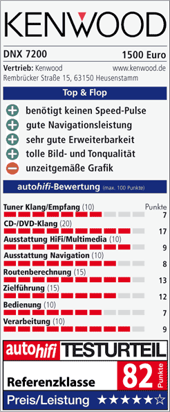 "Der Kenwood DNX7200 vereint DVD-Entertainment, Radio und Navigation in einem Gerät. (...) So wundert es nicht, dass auch das Kenwood eine hervorragende, benutzerfreundliche und absolut zuverlässige Navigation bietet. Die Qualität und Geschwindigkeit der GPS-Positionierung ist mittlerweile so hoch, dass man das Fehlen eines Speed-Pulse-Anschlusses eigentlich nur in Tunneln bemerkt. Die Bedienung der Garmin-Software über den fast 7 Zoll großen Touchscreen ist einfach ein Genuss. Endlich einmal Schaltflächen, die wirklich groß genug und auch bei der Fahrt über unebene Strecken sicher zu treffen sind. (...)