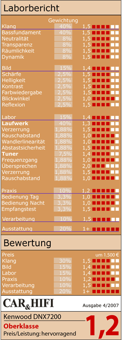 Im Labor- und Klangtest überzeugt das Kenwood auf ganzer Linie. Seine wahren Vorzüge zeigen sich aber erst auf der Straße. Während die Navigation mit ihrer großzügigen Darstellung und präziser Sprachführung zuverlässig den Weg weist, bietet das Kenwood DNX7200 zeitgleich umfangreiche Unterhaltung vom Feinsten für Fahrer und Mitfahrer."
