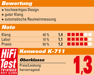 "Mit dem K-711 stellt Kenwood dem Premium-System R-K1 noch einen kleinen Bruder zur Seite, der sich nicht zu verstecken braucht. Denn zum Preis von rund 380 EUR ist dieser CD-Receiver ein richtiges Schnäppchen für Stereo-Freunde, die nicht zuviel Geld für eine kleine Stereo-Anlage ausgeben möchten, aber dennoch Wert auf Qualität legen. Das System begeistert vor allem durch das effektive Einmess-System und die umfangreichen Einstell-Möglichkeiten, die für einen sowohl lebendigen als auch detaillierten Klang sorgen. Die K-711 ist eine richtige Stereo-Anlage im Mini-Format, die die selben Anschlussbuchsen bietet wie man sie auch bei großen Stereo-Verstärkern gewohnt ist. Im Höhenbereich klingt die Anlage sehr transparent und die kleinen Boxen bieten einen erstaunlich voluminösen Bass. Lediglich Freunde von Techno und Dance-Musik dürften die Lautsprecher ab und zu in den Grenzbereich treiben. Im Multimedia-Zeitalter zeigt sich die Kenwood-Anlage offen für die verbreiteten Audio-Formate MP3, WMA und AAC. Schade ist dabei allerdings, dass diese nur von CD abgespielt werden können und es keinen direkten Anschluss für USB-Sticks, Speicherkarten oder eine iPod-Schnittstelle gibt."