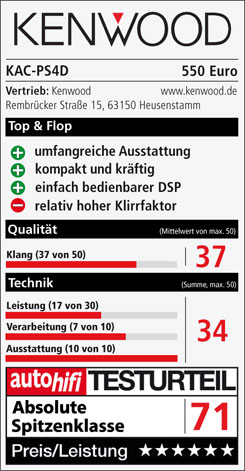 Im Hörtest gab sich der Verstärker sehr feinfühlig, aber dennoch kontrolliert und straff. Schnelle Kicks schmetterte die Endstufe sauber und scharf umrissen in den Hörraum. Dabei verlor sie nie den Überblick über das übrige Musikgeschehen. (….) Alles in allem ist die Kenwood KAC-PS4D eine rundum gelungene Endstufe, die aus einem sehr kompakten und appetitlich gestalteten Gehäuse jede Menge Power schöpft. Und angesichts ihrer komfortablen DSP-Ausstattung ist die Kenwood den aufgerufenen Preis von rund 550 Euro auf jeden Fall wert."