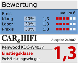 Im Hörraum spielte sich das 4037 schnell an die Spitze des Feldes. CDs gab es sehr räumlich und real wieder, den Stimm- und Hochtonbereich von Tracy Chapmans "Telling Stories" veredelte es mit einer gehörigen Portion Schmelz und Emotion. Die feine Auflösung der hohen Töne ließ ein sehr räumliches Klangbild entstehen, dass von einem sauberen Bass und knackigen Mitten komplettiert wurde. Auch im Radiobetrieb gab es an den Leistungen des Kenwood nichts auszusetzen: Er spielte sauber und stabil."