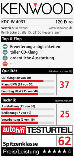 Mit dem KDC-W4037 bietet Kenwood ein äußerst hochwertiges und gut ausgestattetes CD-Radio – für gerade einmal 120 Euro ist das ein echter Knüller.“