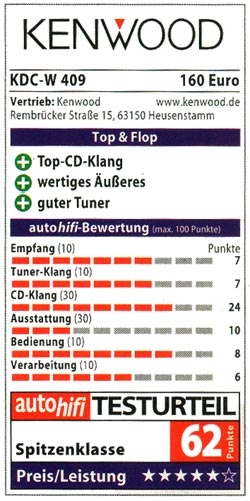 Das KDC-W409 kann sich mit seiner aluminiumartigen Frontblende und dem wertigen Äußeren optisch gut in Szene setzen. Der große Drehregler auf der linken Seite und die wenigen, gut erreichbaren Knöpfe vereinfachen die Bedienung enorm. [...] Kenwoods neuer K3I-Tuner kann sich in der Praxis sehr gut behaupten, dank der automatischen Bandbreitenumschaltung gibt es auch im Stadtbetrieb keinerlei Probleme.