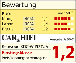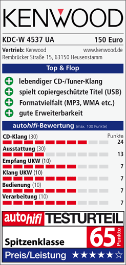 (...) Als Punktsieger steigt das Kenwood KDC-W4537UA aus dem Ring. Sein lebendiger Sound und die Fähigkeit, kopiergeschützte Titel via USB abzuspielen, heben ihn hervor.(...)"