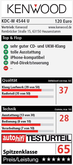 Das Kenwood KDC-W4544U ist nagelneu und wird Ende 2008 für 120 Euro zu haben sein. Das Radio besticht durch dezente Optik und leichte Bedienbarkeit: Die Tasten sind logisch angeordnet, der Drehregler ist gut zu betätigen – das geht selbst Newbees leicht von der Hand. Auch die Suche nach Liedern auf einer MP3-CD klappt erfreulich schnell.