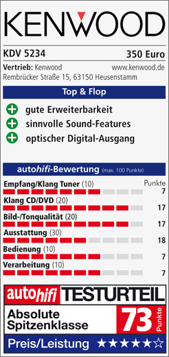 “Zum sorgfältig gepflegten Programm eines Autoradio-Herstellers gehört in unserer Zeit auch ein DVD-Radio. Kenwoods Vertreter in dieser Sparte heißt KDV-5234 (350 Euro) und bringt die Verarbeitungsqualität seiner CD-Kollegen genauso mit wie eine Reihe innerer Werte. (…)